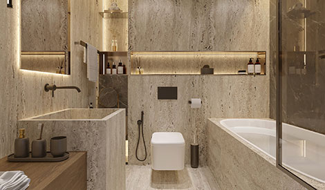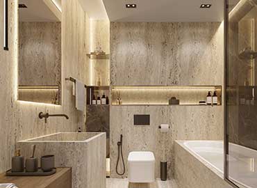 Un espace de détente et de luxe, avec des matériaux de haute qualité comme le marbre et la porcelaine. Équipements modernes, éclairage doux et rangements astucieux créent une atmosphère de spa à domicile.